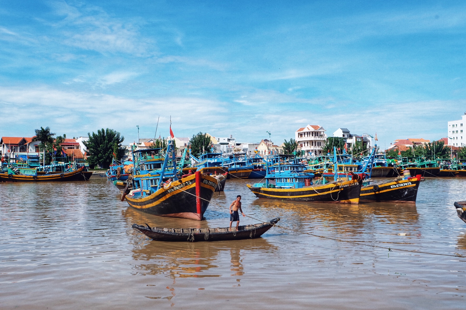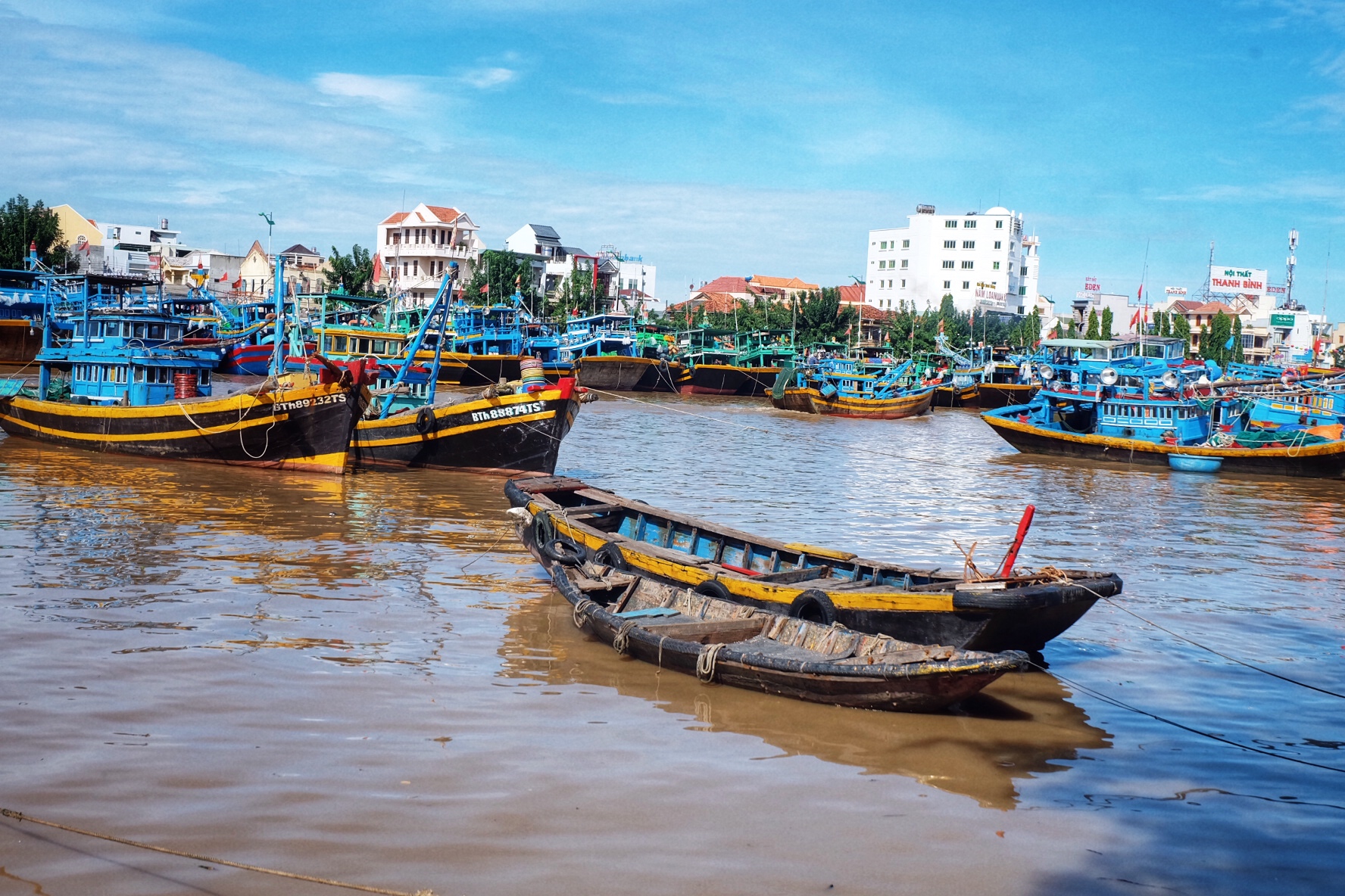 Nhớ ngày đầu mới đến, vẫn còn bỡ ngỡ trên con đường eo biển lộng gió, một bên là núi, bên kia là biển vs trời hòa làm một, mà vừa đi vừa hú hét đến hơi khe khé cổ. Cái bụng không lúc nào được nghỉ mà vẫn cố gắng mon men tới Vĩnh Hy để thưởng thức tiếp, cũng bởi nghiện quá, trái tim chết lịm trước cảnh làng chài dân dã của người dân khi cuối chiều buông xuống. Tiếng leng keng xa xa của tàu đang về đậu ven vịnh, tiếng trẻ con nô đùa ngay cầu cảng, tiếng các mẹ xì xào mang thúng – mang xoong ra mở quán hải sản với bánh canh. Chỉ một khoảng sân ngay đầu chợ của làng chài Vĩnh Hy đấy mà màu sắc đến xiêu lòng, mình thích ngắm nó, và hòa vào nó, hơn là lẩn khuất đâu xa giữa khu resort đầy sự mờ nhạt ở phía núi đối diện kia….Nắng còn đang buông, 5 người bạn với 5 bát bánh canh chả cá thêm chai nước tảo biển vẫn đẹp giữa một góc sân của làng chài.