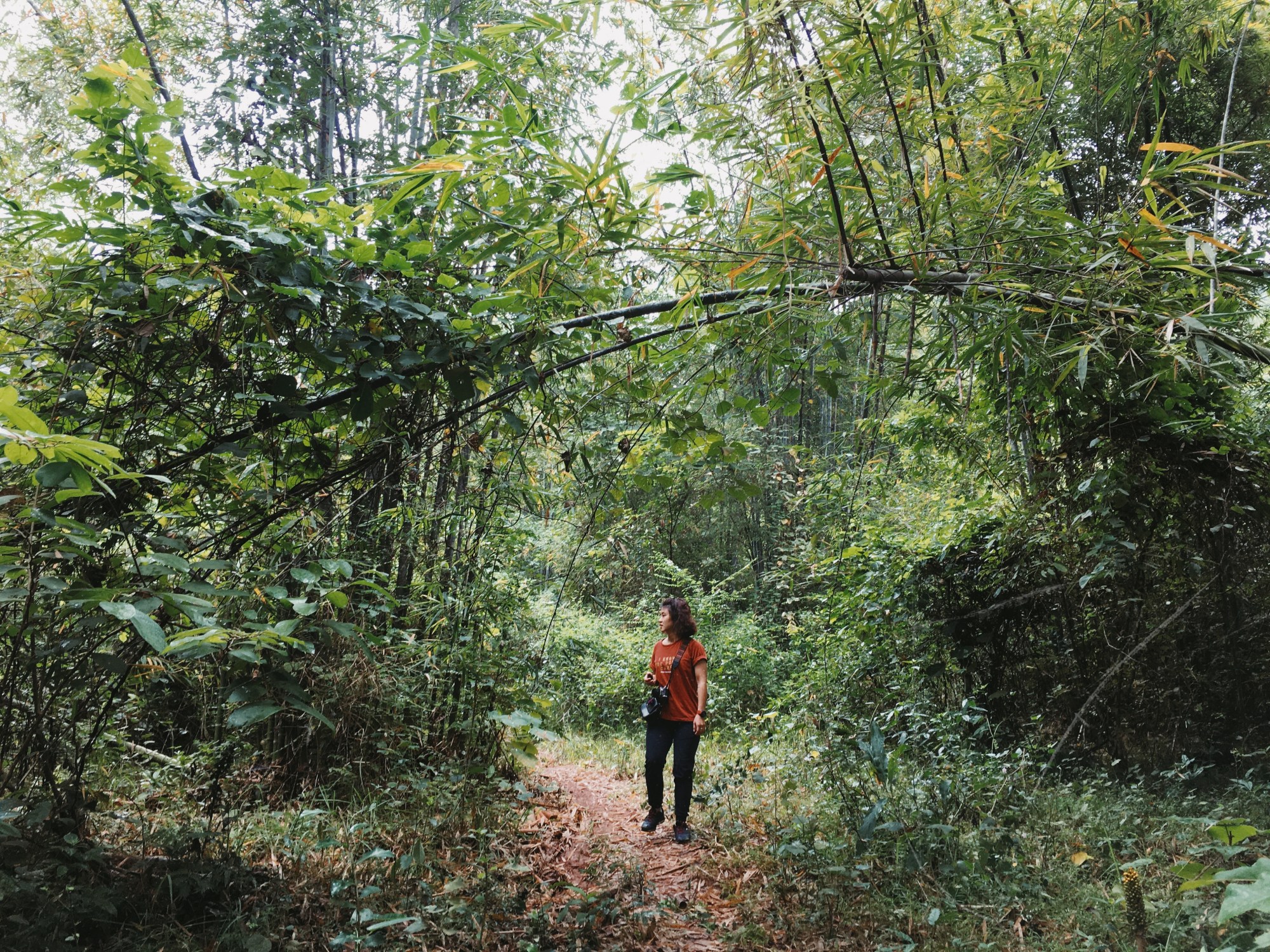 Câu chuyện cũng không có gì đáng nói nếu vượt qua 30′ con đường mòn có hàng tre 2 bên cũng khá dễ đi, thêm 30′ nữa đúng chất leo trèo, bò trườn và lần mò theo cảm tính….Quả thật mình không mệt và cũng không có ngại truyện leo trèo, nhưng mình cần 1 người có bản lĩnh đi rừng hơn, Châu hăng máu quá mà cứ lấn xông tới, cho tới khi quay lại thì suýt lạc đường không thấy điểm ra, một phen hú vía cho con tim rớt vài nhịp, thật sự rất may mới chị lạc có xíu và đã tìm được đường trở về…Ầy gu, khu rừng bỗng dưng lại khiến mình thấy sợ.