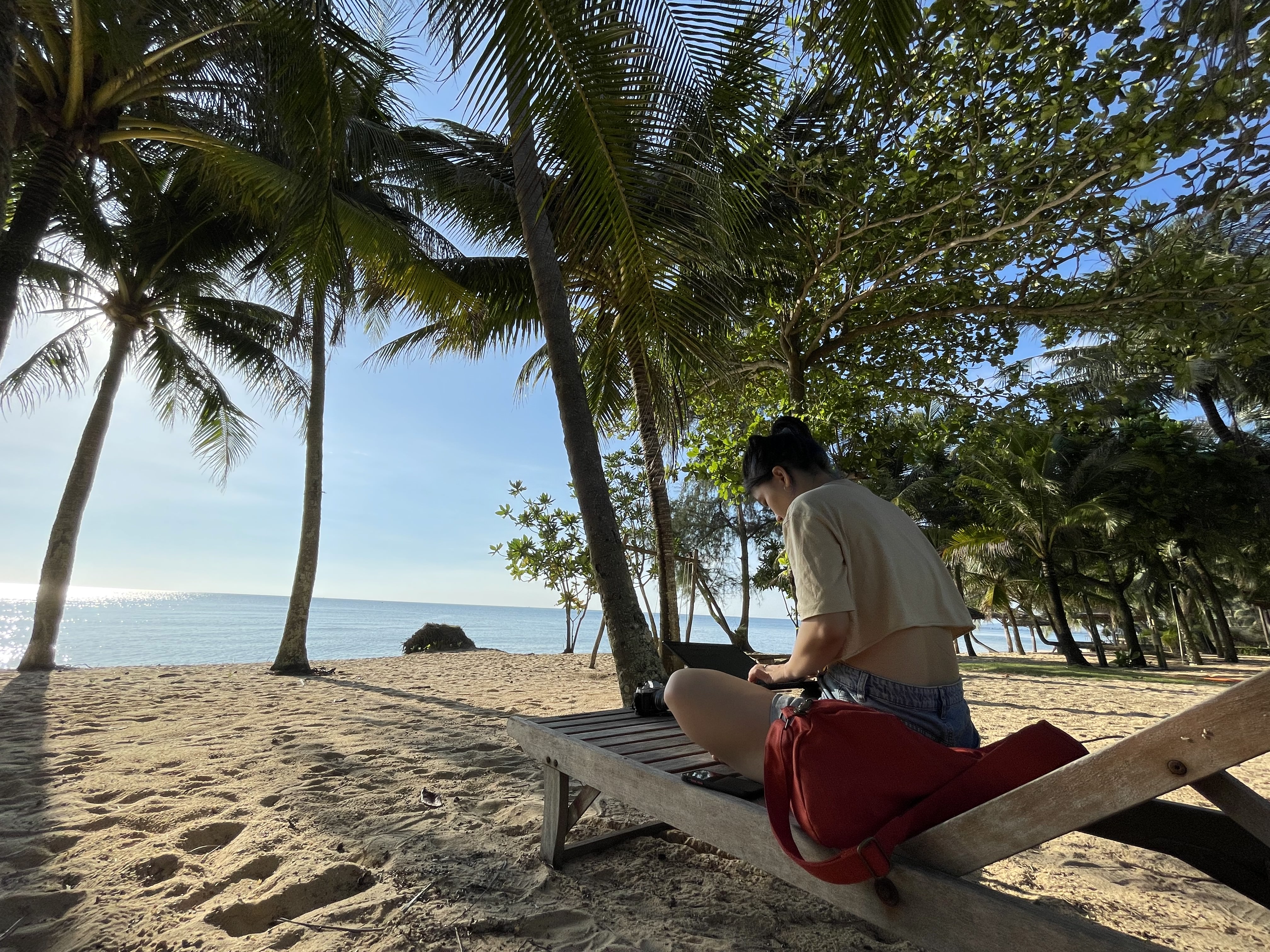 Và cùng từ chính Trường và Khôi ấy, 2 bạn thích khám phá và lần mò những điều không ai hay mấy về Phú Quốc, 2 bạn đã chỉ về bãi Ông Lang hoặc Vũng Bầu để camping. Và quả thật, con đường tới Vũng Bầu cho tới bãi biển đều khiến mình đi từ những bất ngờ này đến bất ngờ khác. Để đến được bãi biển, tụi mình cần phải men theo đường đất đỏ với 2 hàng cây xanh rì bao quanh, mát rượi và hút tầm mắt, và khi chạm được tới biển, là hàng cây xanh rì, là bãi cát trắng, là vũng biển trong veo ngập nắng chiều buông, quả là 1 điểm chân ái cho việc cắm trại qua đêm và ngắm hoàng hôn bên lon bia lạnh…. truyện vẫn đẹp và hết sức lý thú khi tụi tớ dựng 2 lều và tắm biển, nghe nhạc và chuẩn bị đồ ăn đêm, chỉ cho đến khi cơn mưa ào tới và anh hải quan đi tuần đến thông báo ” Vì lý do dịch bệnh, nên mọi người sẽ không ở lại đây quá 8h tối…”