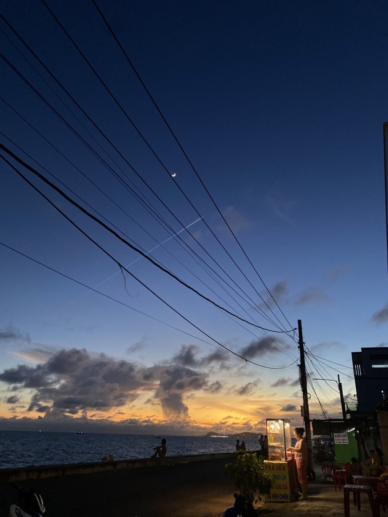 Trưa thì bạn ghé quán Thiên Ân ngay biển để thưởng thức Hải sản, chiều thị chạy dọc xuống làng chài mua Hải sản tối về nướng hoặc hấp, chiều tà thì ra bờ kè chén món bánh chén (quán ở giữa, nằm trong hẻm nhỏ, hiện chỉ có 3 quán bán bánh chén, nhưng quán này của cụ già là ngon nhất, quán không có tên nhưng chắc chắn là chui vào ngách hẻm nho nhỏ để măm nha). Tối thì đảo lại the Vietgangs, quán nhậu ngay ben Thiên Ân, bởi dẫu quán theo phong cách của glamping – cho các bạn nhỏ camping và nướng thịt là chủ yếu. Về phần mình thì thấy không gian rộng và con mới nên là chưa thành “rối như canh hẹ“, nhưng về sau đông người lui tới thì chắc chắn sẽ như cái chợ vô tổ chức như hồ Trị An. Chủ quán cũng không phải là người có gu cho lắm, thích phục vụ số đông nên tận dụng từng milimet, chắc chắn sẽ bị ảnh hưởng kiểu tiếng ồn và dơ vì phòng vệ sinh xa, lại nhỏ hẹp, …..Quán cũng chỉ chuyên nướng thịt theo style hội người sợ Hải sản nên khá là nhàm nhàm, chưa kể gu nhạc thì thật là…….Sẽ mừng cho họ khi có một hình thức mới, nhưng sẽ hơi buồn thì vì dẫu – cái chất – dịch vụ lại không được tới nơi, tới chốn…..